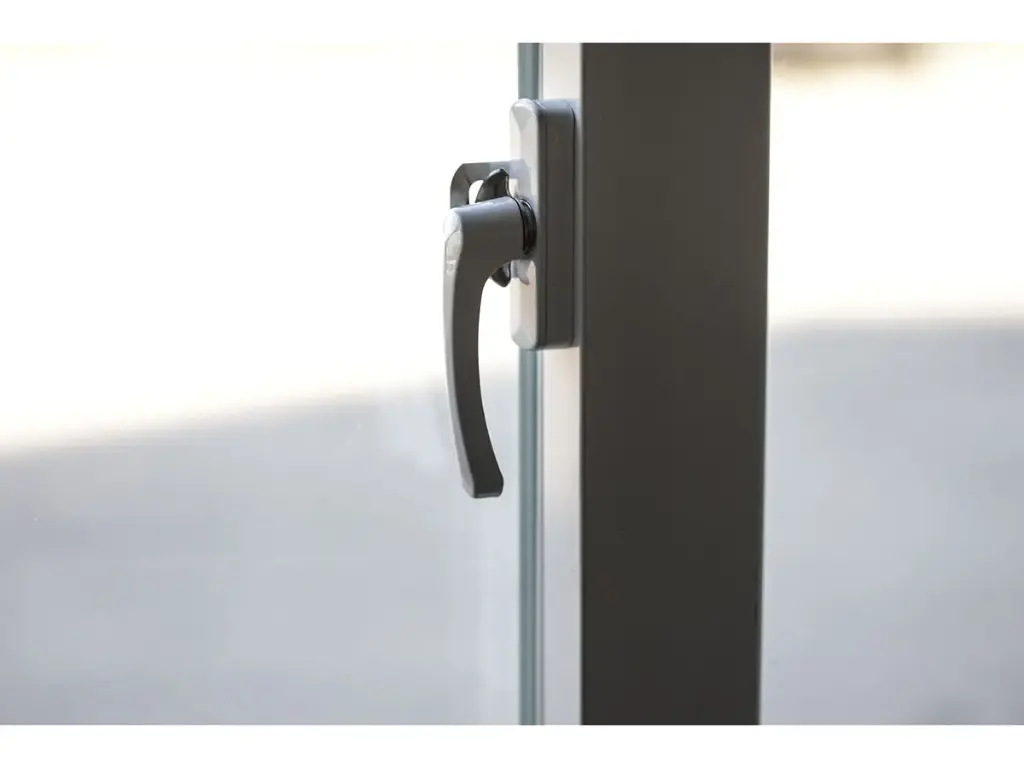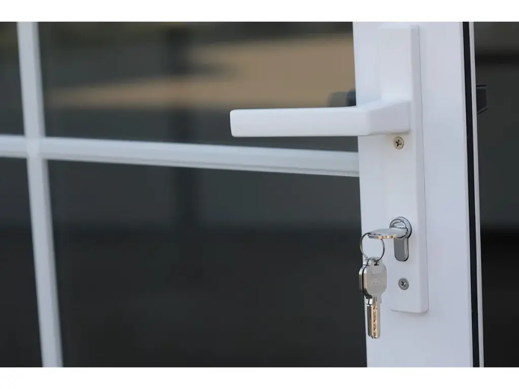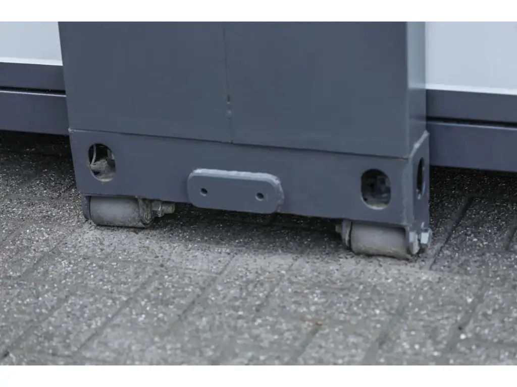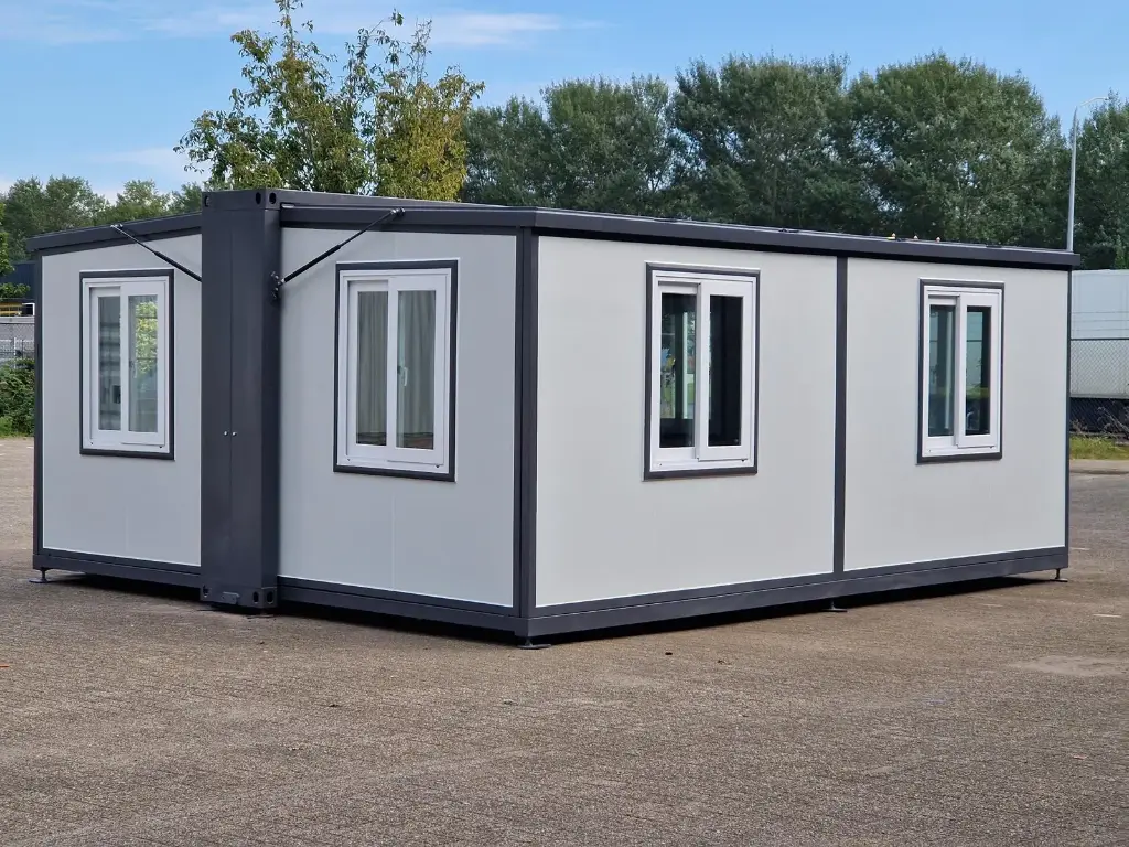 Provided with: plastic frames, double glazing, insulated walls and roof, drainage gutter, vinyl flooring, lockable with key, 2 hand winches for lowering the floor, folded dimensions for transport 5890 x 720 x 2550 mm, adjustable feet, 2 rear casters, all 8 windows can be opened and are equipped with mosquito nets, 28 m² space, unused