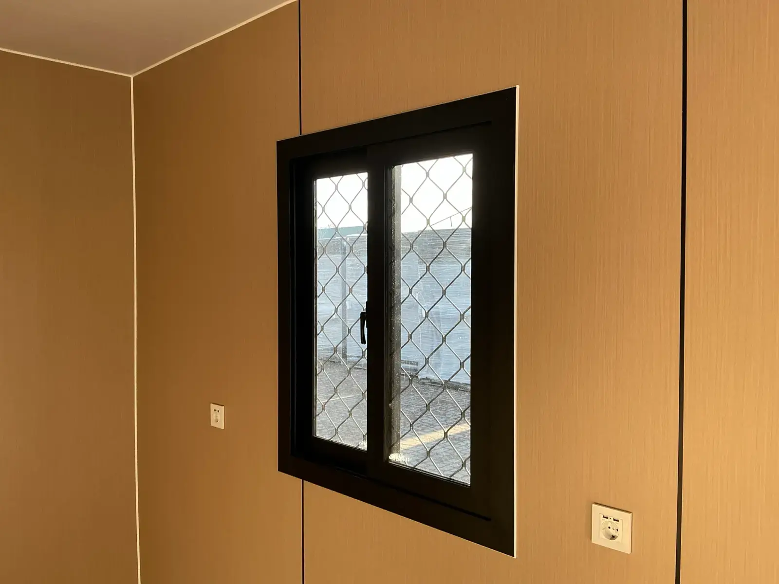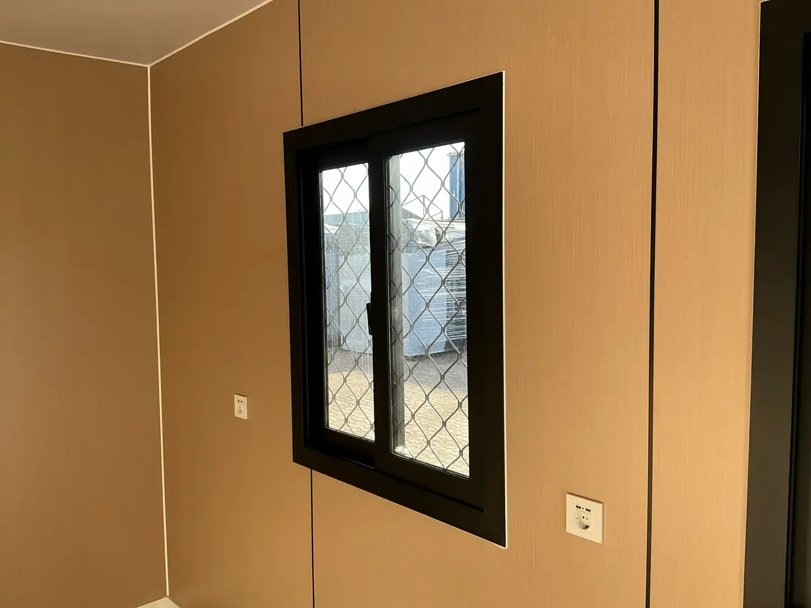 40-foot HQ container with 2 living spaces. Each living area has a separate bathroom. The bathroom includes a shower, toilet, vanity (sink with storage cabinet and toilet), a double-glazed tilt/turn window in an aluminum frame, an electric ceiling fan, a 230-volt outlet, and bathroom fixtures. The living area consists of a kitchen unit with storage, sliding windows and double-glazed tilt/turn windows in aluminum frames, 230-volt outlets with USB ports, ceiling lights, and vinyl flooring with baseboards.