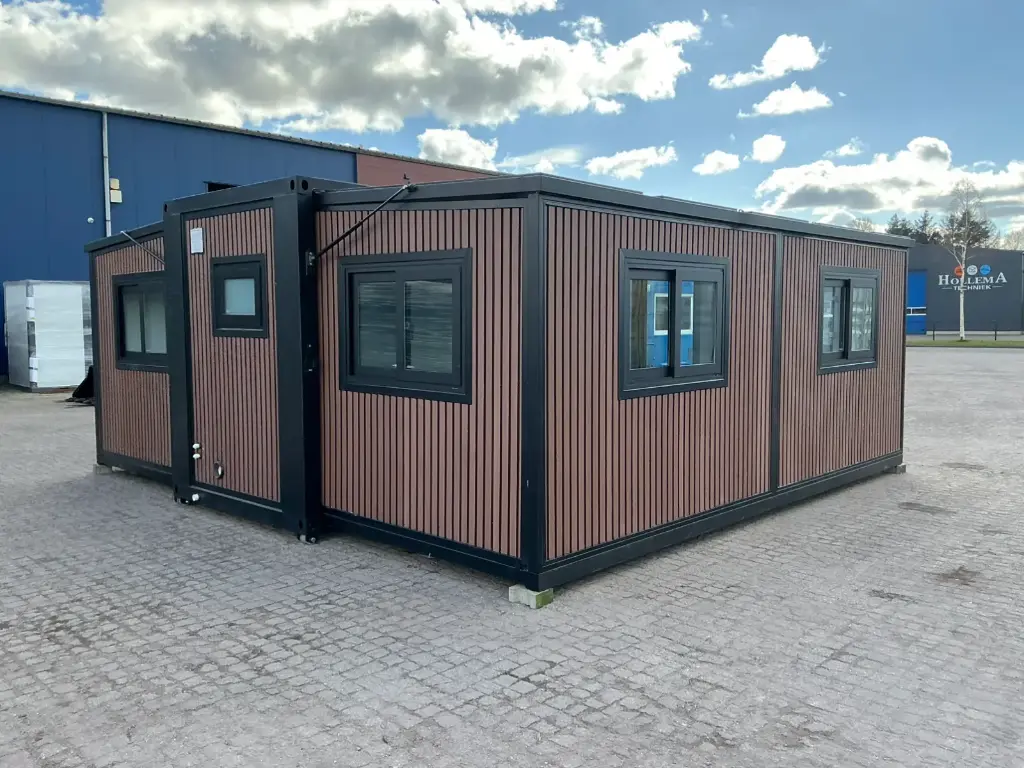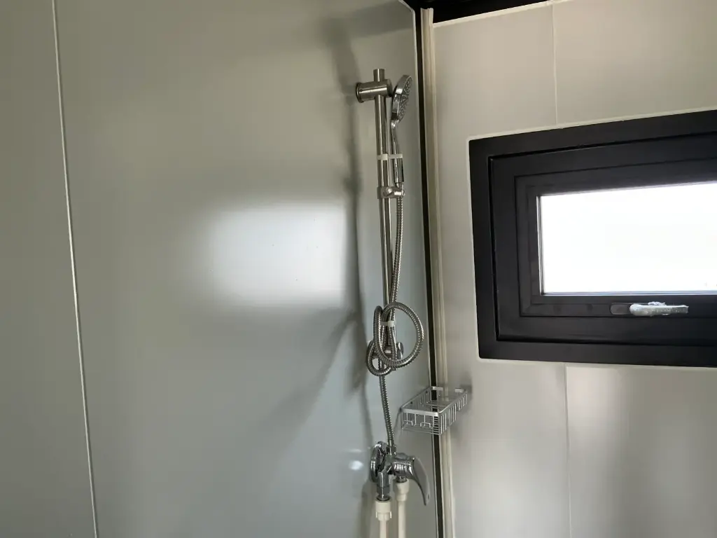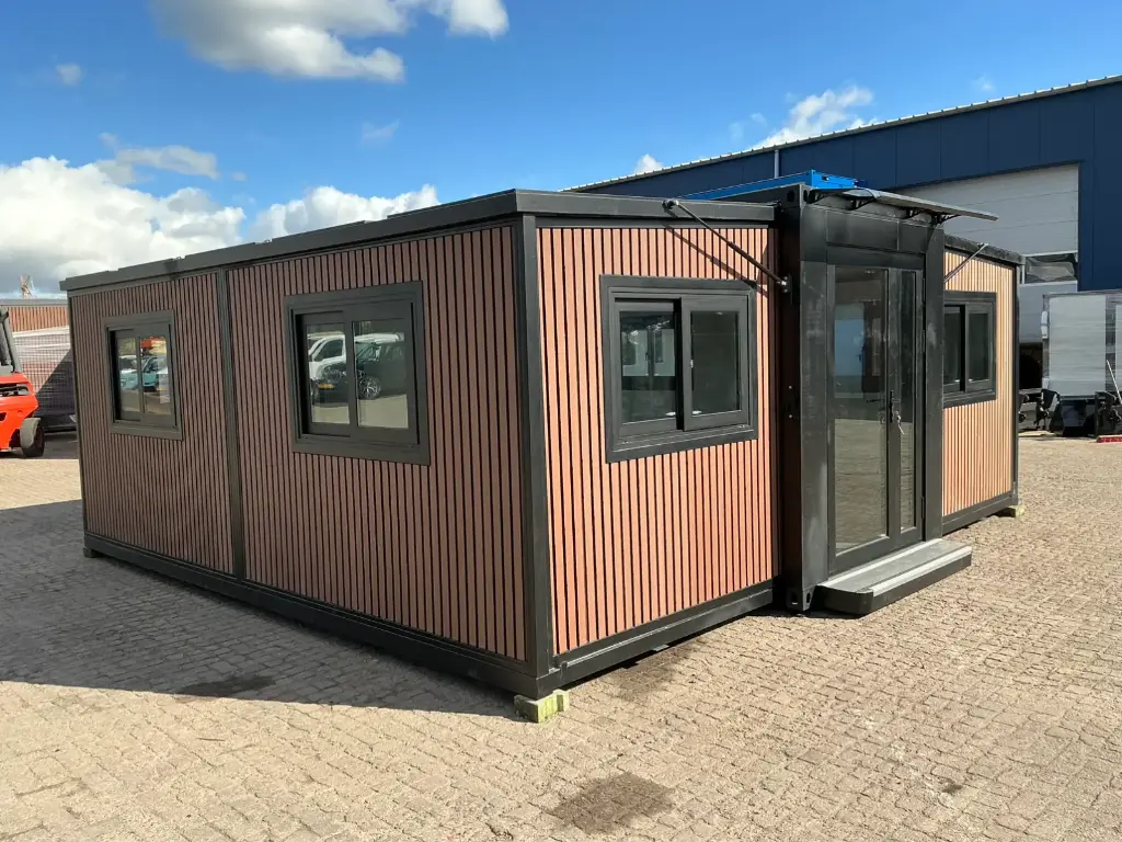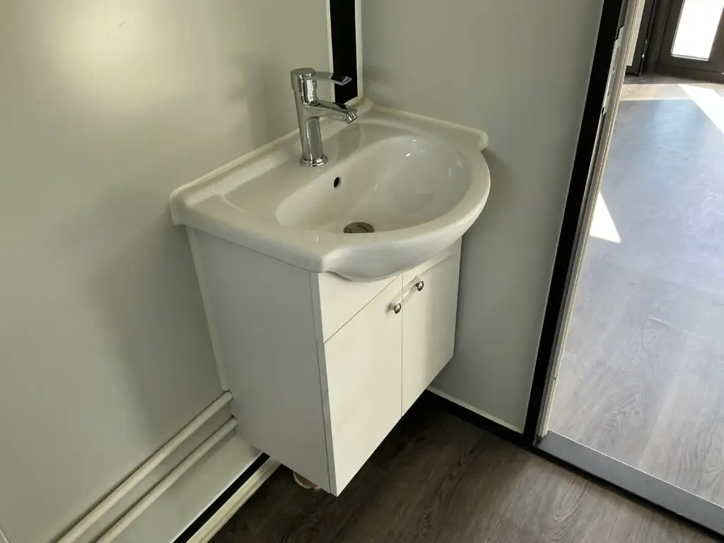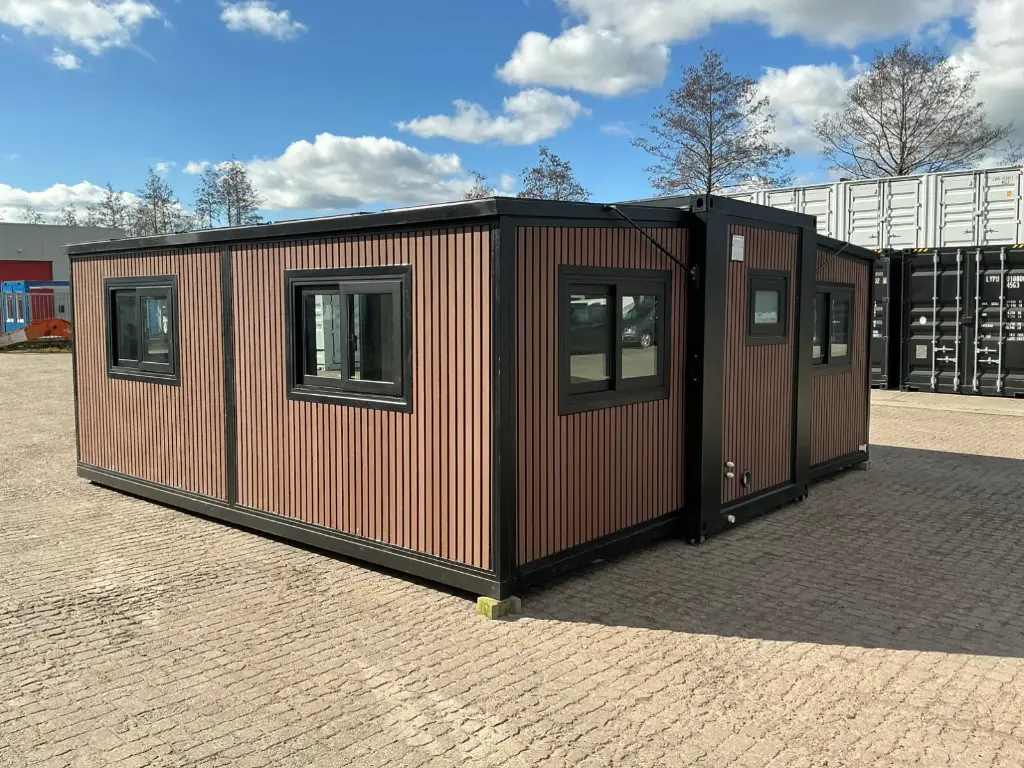 Equipped with insulated walls and roof, bathroom with toilet and shower, sink with vanity unit and storage space, vinyl flooring, bathroom with fan, landing, awning. Dimensions unfolded: 5791×6096 mm; dimensions folded (transport dimensions): (LxWxH) 5860x2110x2550 mm; unused