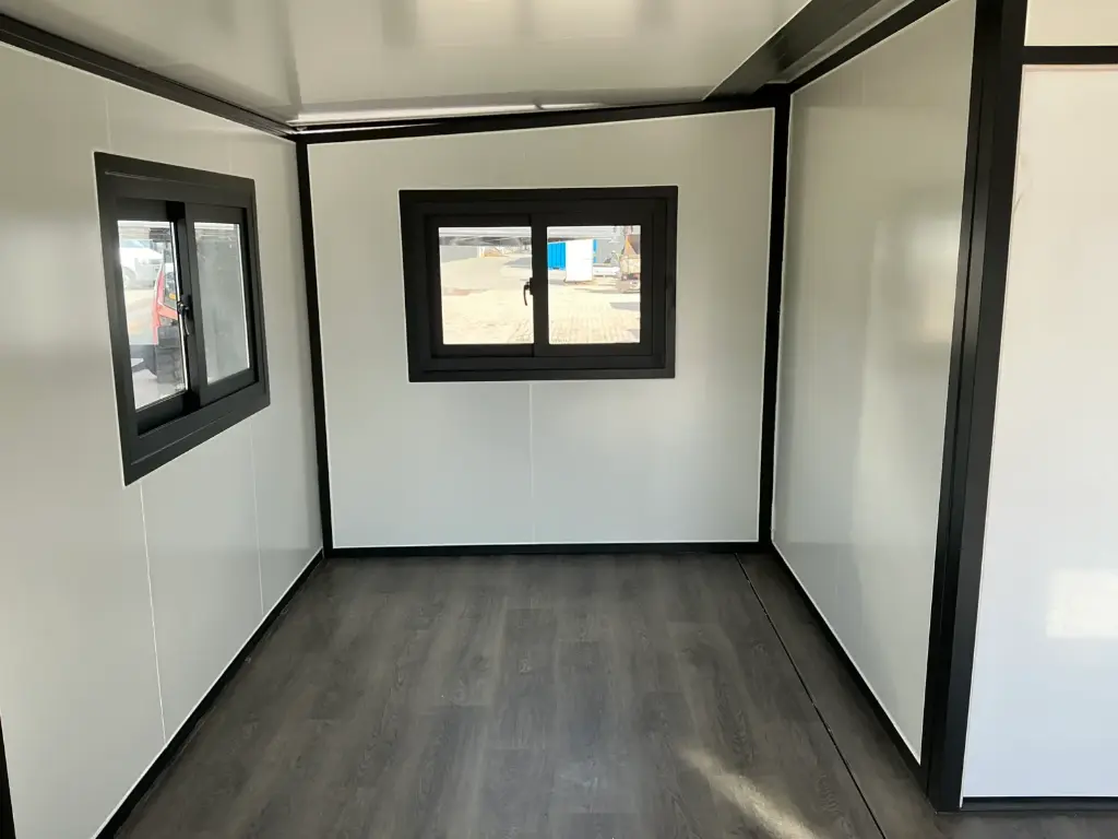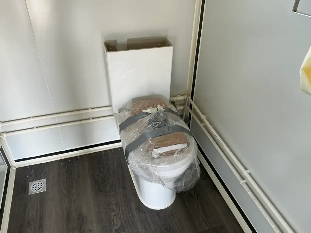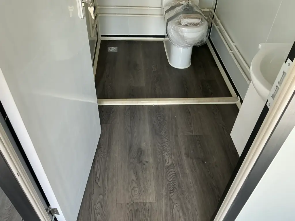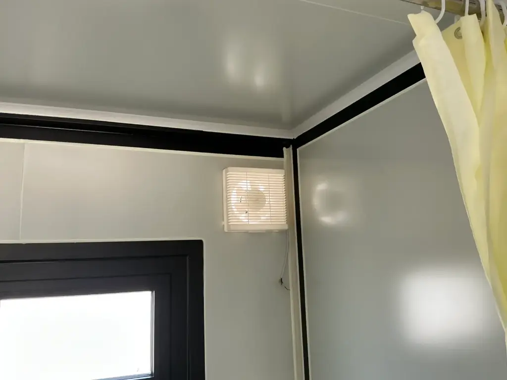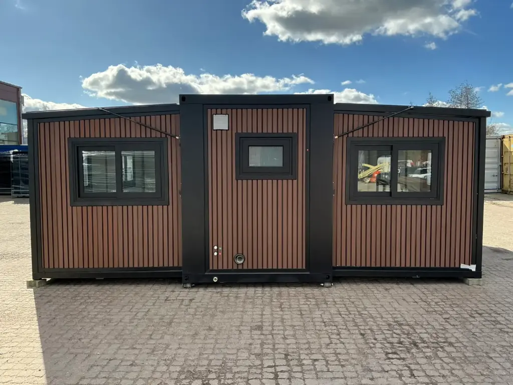 Equipped with insulated walls and roof, bathroom with toilet and shower, sink with vanity unit and storage space, vinyl flooring, bathroom with fan, landing, awning. Dimensions unfolded: 5791×6096 mm; dimensions folded (transport dimensions): (LxWxH) 5860x2110x2550 mm; unused